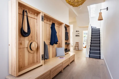 This boot bench was designed for a very specific place in the client's new home. The priority was to create a design that is practical and that avoids making the confined area cluttered.